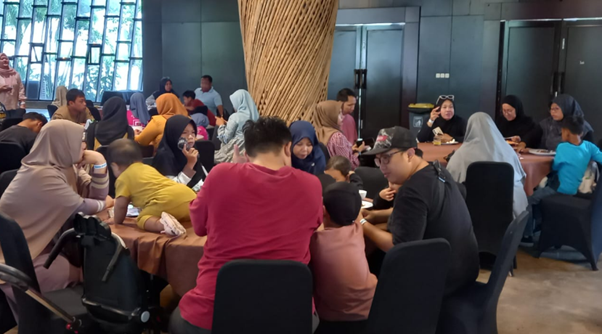 Tepat pukul 11 rombongan menikmati Sajian Makan siang di Ball room dengan fasilitas yang nyaman dan memuaskan. Sembari menikmati suasana, diselingi dengan acara ramah - tamah. Pada sesi ini Fitri Sari Sukmawati, M.Pd mengucapkan terimakasih partisipasi seluruh GTK yang sudah meluangkan waktu bersama keluarga dalam kegiatan Gathering. Semoga kegiatan ini menjalin keakraban antar keluarga dan mempererat kekeluargaan antar keluarga.