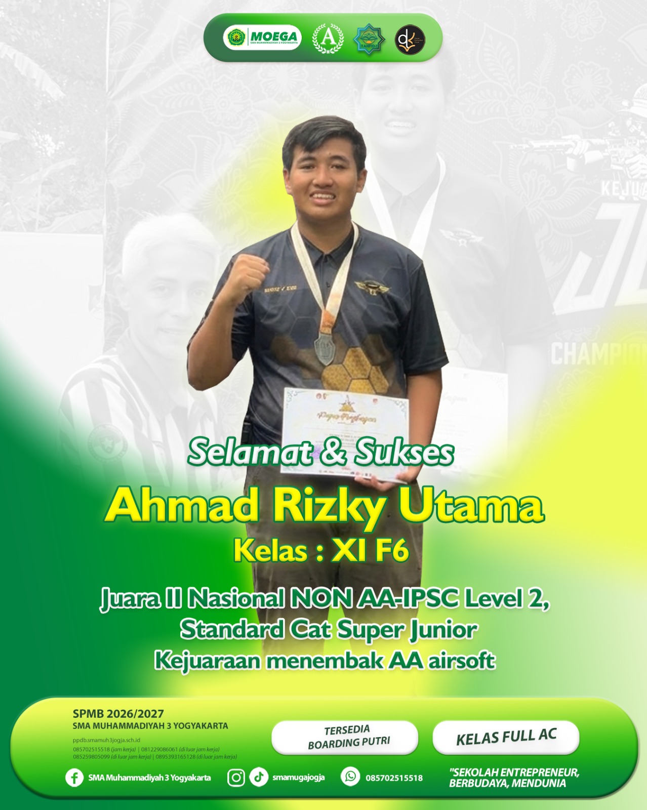 Pada Apel pagi Senin 9 Februari 2026 kepala sekolah SMA Muhammadiyah 3 Yogyakarta meyerahkan reward kepada Ananda Ahmaf Rizky kelas XI F6 karena berhasil medapatkan juara 2 nasional Non AA - IPSC level 2 standar cat super junior kejuaraan menembak AA Air soft. Prestasi ini sangat membanggakan bagi SMA Muhammadiyah 3 Yogyakarta.Penyerahan hadiah di berikan di depan siswa siswi kelas XI yang sedang apel pagi dan di sambut dengan aplaus yang meriah. Semoga prestasi kali ini di ikuti dengan prestasi yang lain.