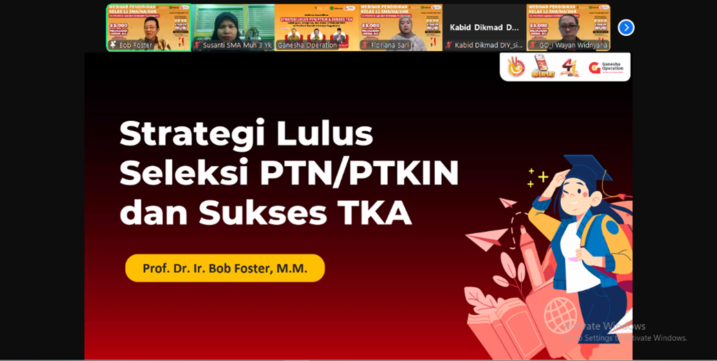 Yogyakarta, 25/09/2025 – SMA Muhammadiyah 3 Yogyakarta turut berpartisipasi dalam kegiatan Webinar Strategi Lulus PTN/PT Kedinasan dan Sukses TKA yang diselenggarakan oleh Dinas Pendidikan Pemuda dan Olahraga (Disdikpora) Provinsi DIY bekerja sama dengan Ganesha Operation. Acara berlangsung pada Kamis (25/9) pukul 09.00–11.00 WIB melalui platform Zoom Meeting.