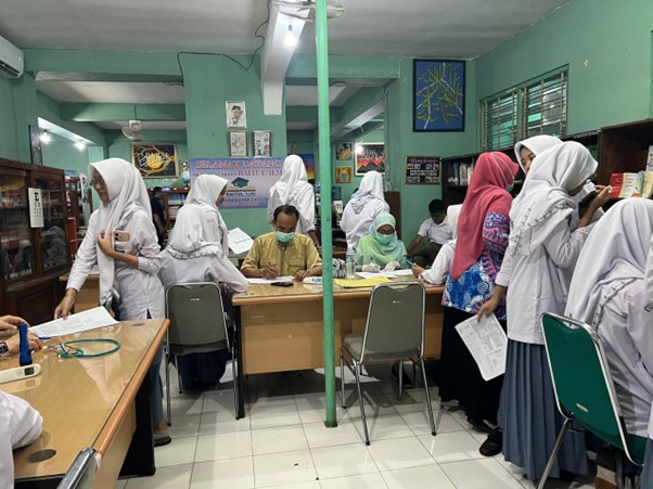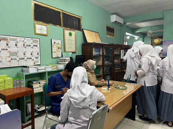 Hari pertama screening di ikuti oleh siswa kelas XI mulai dari jam ke 1 sampai jam ke 5. Selanjutnya mulai jam ke 6 sd jam ke 11 diikuti oleh siswa kelas 10. Agar kegatan pembelajaran tetap berjalan optimal, maka siswa diperiksa secara bergantian disetiap kelas.