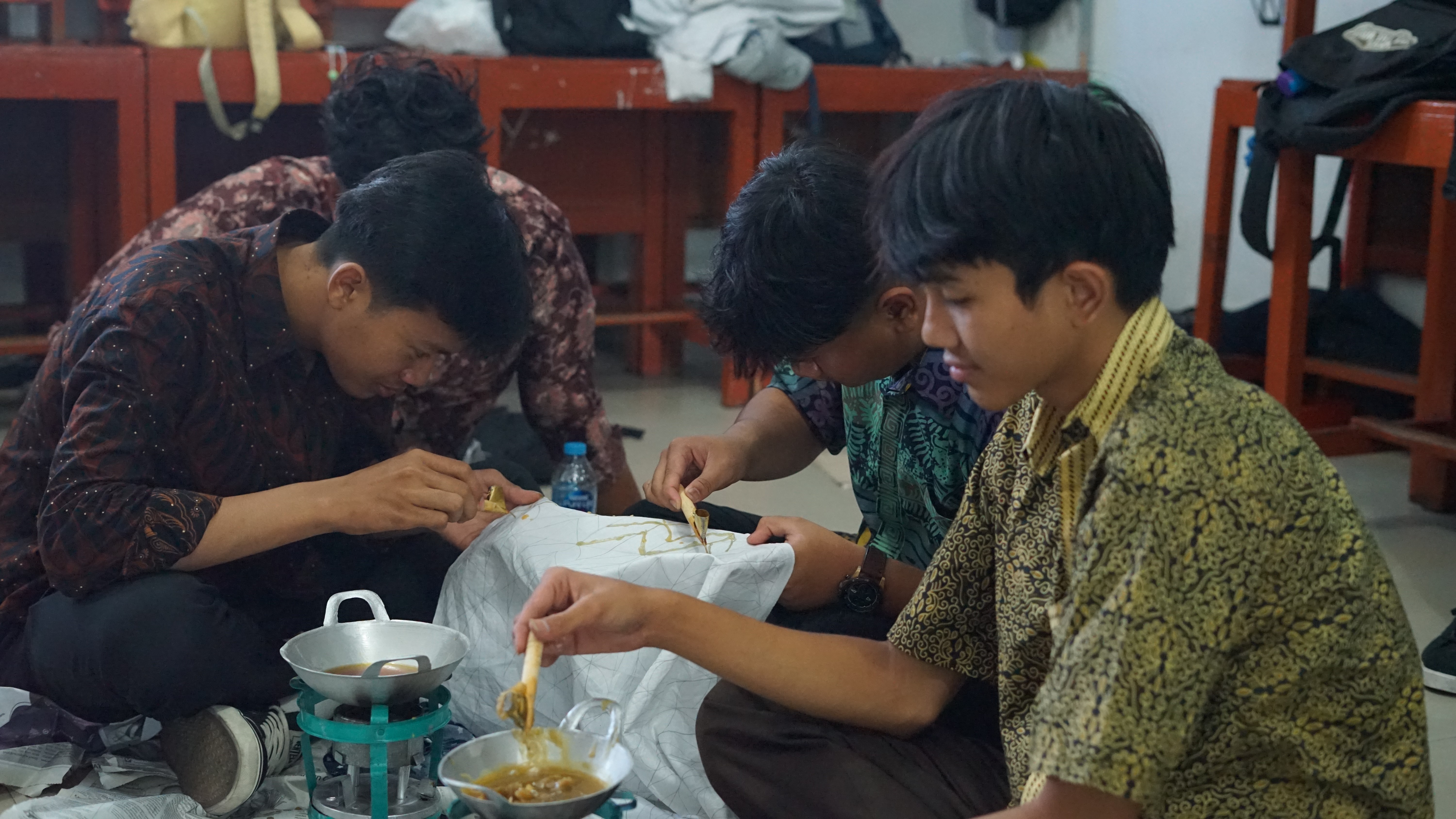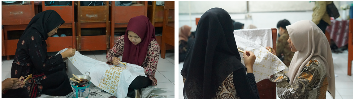 Pada hari Selasa, para siswa telah mempersiapkan pola batik yang akan digunakan dalam kegiatan hari ini. Mereka terbagi dalam kelompok-kelompok untuk memulai proses membatik dengan menggunakan teknik tradisional. Proses membatik dimulai dengan melelehkan malam, yaitu bahan lilin khusus, di atas wajan dengan api panas. Cairan malam yang sudah meleleh kemudian dituangkan ke atas kain sesuai dengan pola yang telah digambar menggunakan canting, yaitu alat untuk mencanting malam pada kain.